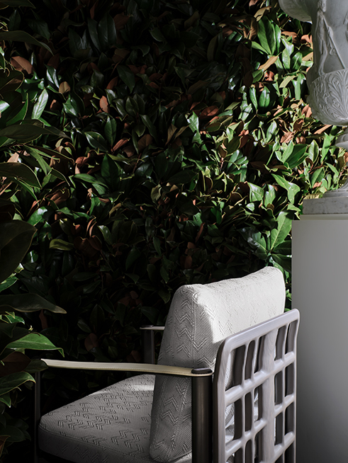 Enhancing the scene are a stone frog, recalling the aesthetics of historic Italian fountains, and a neoclassical vase. These details coexist with magnolia leaves, a tribute to Renaissance gardens and to the sound of water as an element of well-being and contemplation
