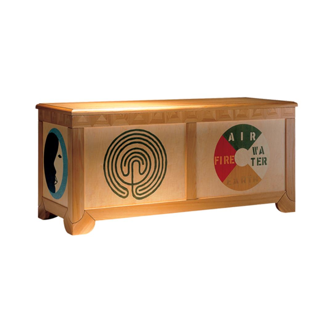 Chest. Signed original. Elm-wood frame. Maple panels with polychrome inlays. Inside with drop-front drawer.