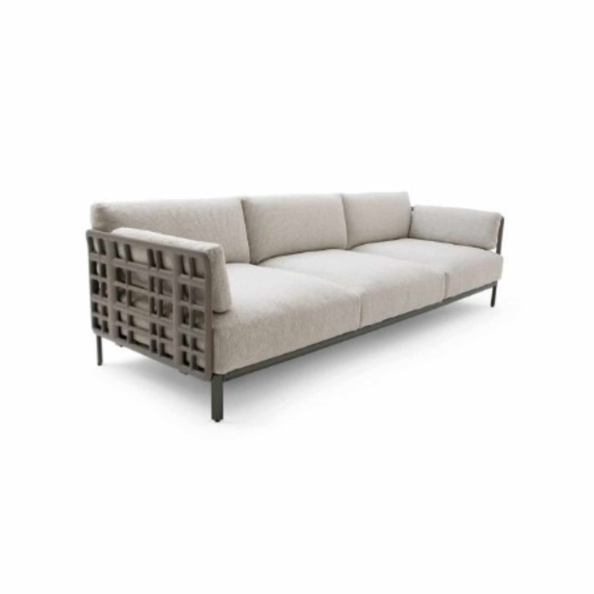 Modular sofa, armchair and pouf for outdoors with structure in painted metal with backrests and armrests in birch plywood. The cushions are covered with waterproof fabric.