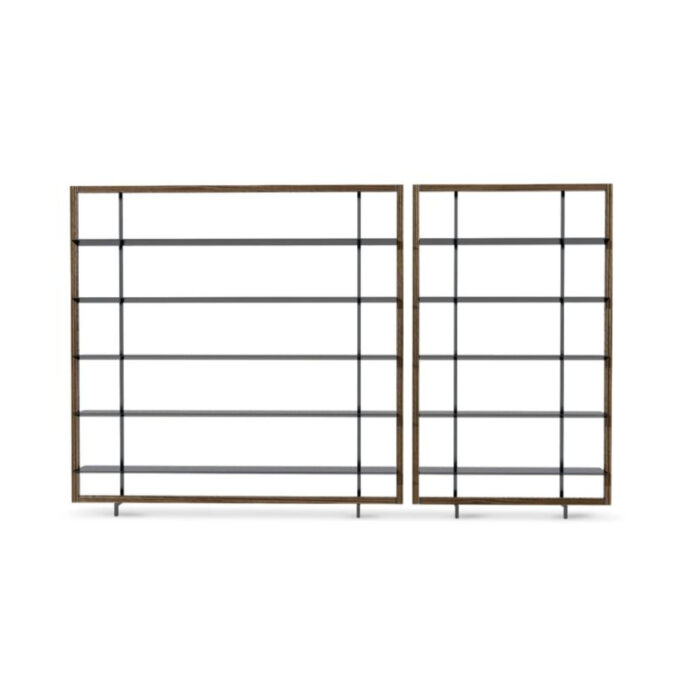 With its wooden frame protruding from the wall-mounted metal structure, the Alix lightweight bookcase furnishes the wall by breaking its monotony. The careful choice of materials is at the core of this project, consisting of simple and linear shapes: the concept is strengthened by the use of aluminium, a cold and tenacious material that makes the structure optically light, combined with the warmth of the wood, the real star of Alix’s design.