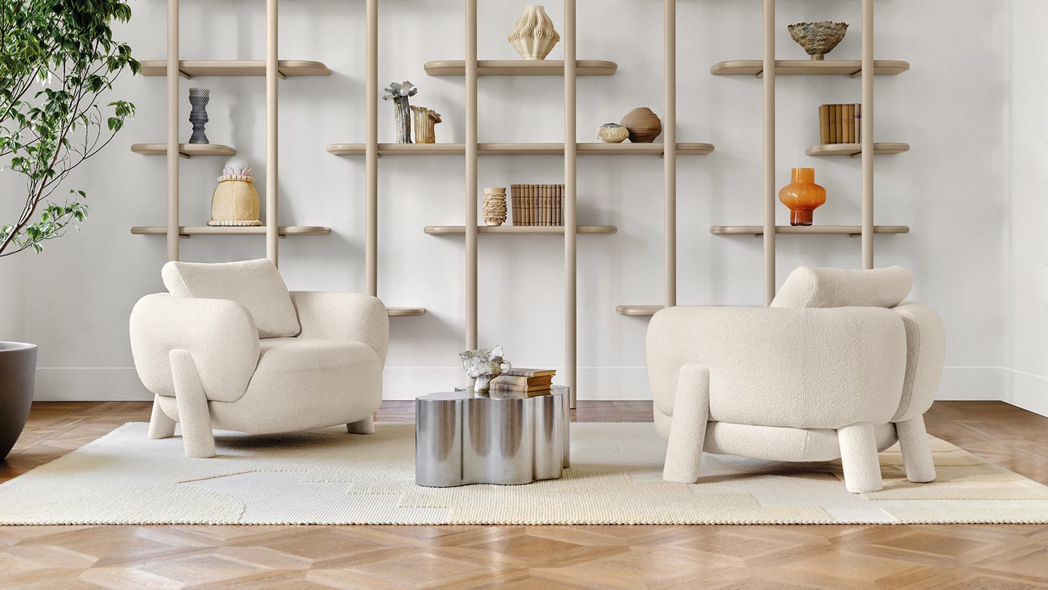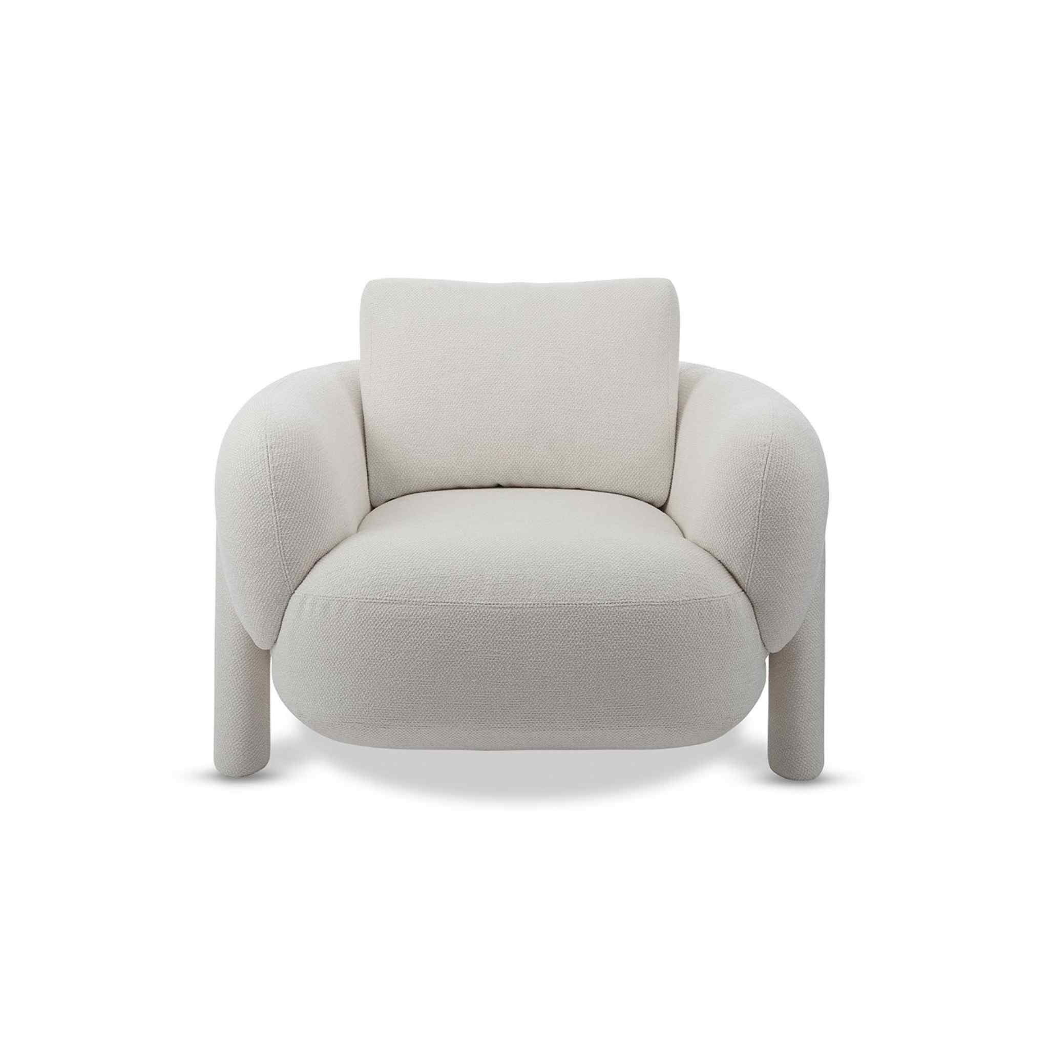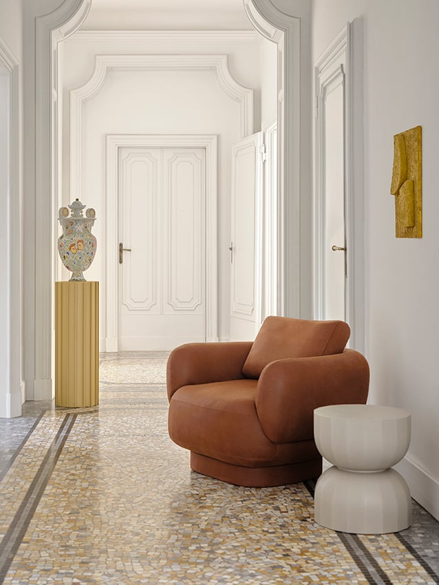 The soft and round shapes of the Anam armchair appear to be sculpted in air, resting on columns as if belonging to a parallel world, reigned by balance.