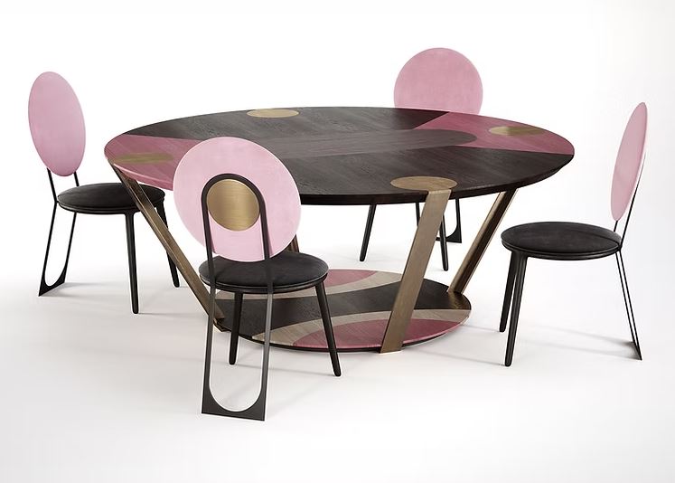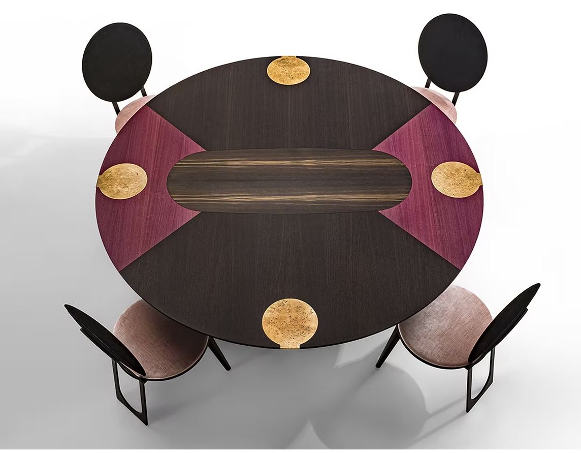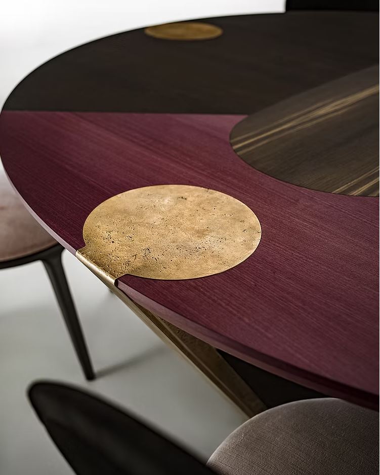 The ATLAS table, which takes its name from Atlas, the titan who holds up the entire sky, features large cast bronze “arms” with circular “hands” that support the large top, coloured with a skilful use of the beautiful hues of natural wood.
