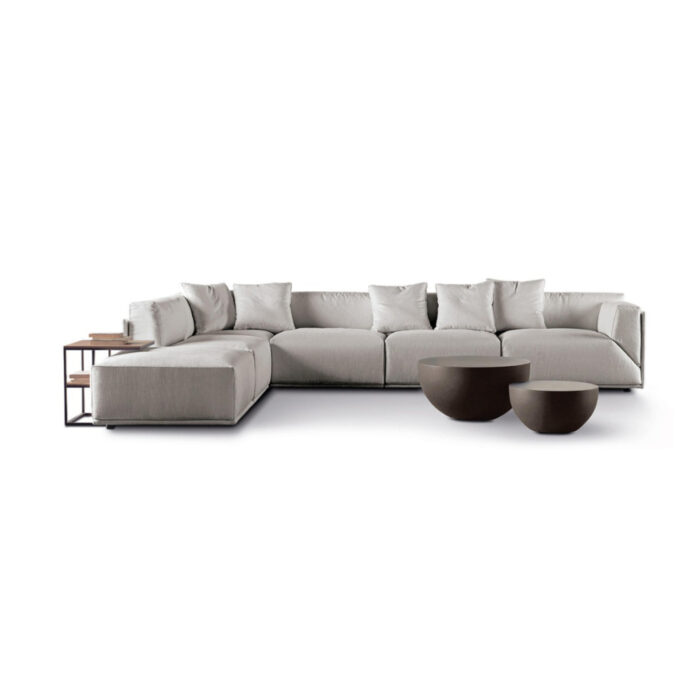 Modular sofa with pure shapes and an exceptional modular versatility. The thin outer frame is also available in the saddle leather version for a more decisive look, while the soft back and seat cushions are characterized by the net cut to 45 degrees. The different elements are available in different sizes and in two depths to allow the outmost versatility. The outer frame allows refined combinations of textiles and leather or else of different fabrics.