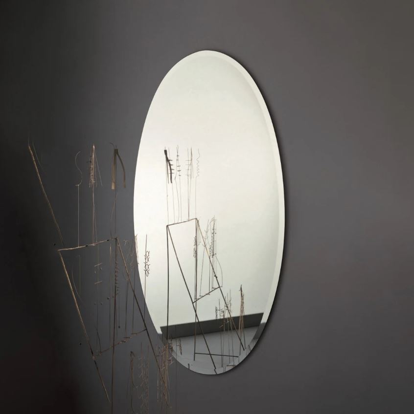 Set of mirrors whose external edges are chamfered with a depth of 3 cm. The oval and rectangular-shaped mirrors have a double horizontal and vertical fixture.