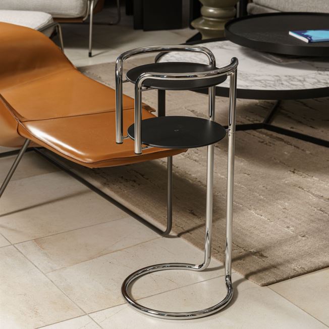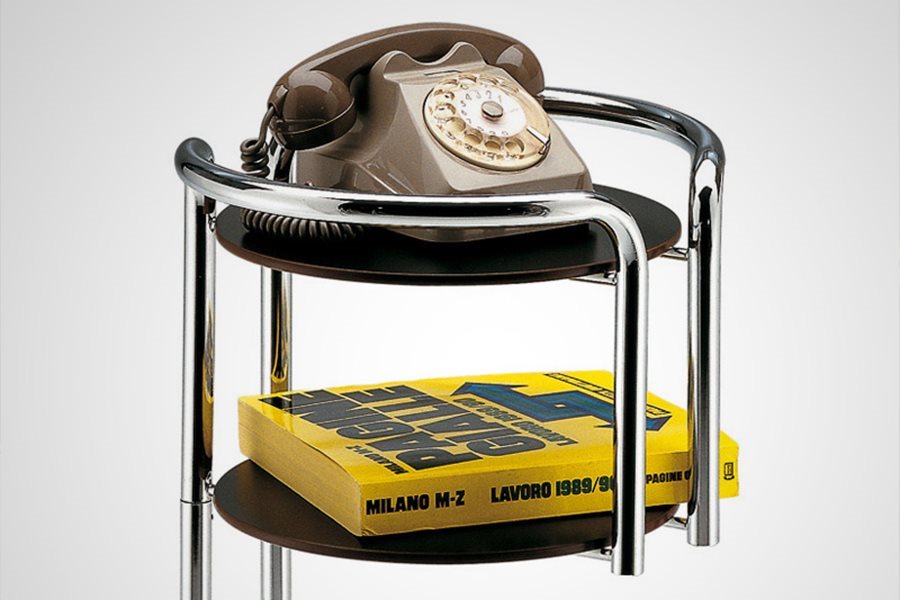 Objects stand. Chromium-plated, tubular steel frame. Shelves in reversible white/black layered plastic laminate.