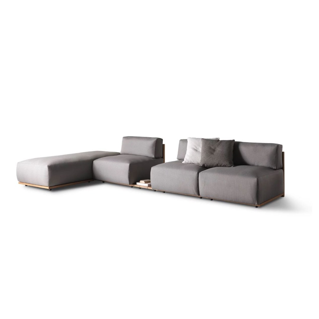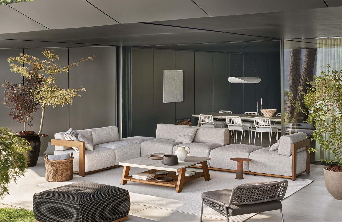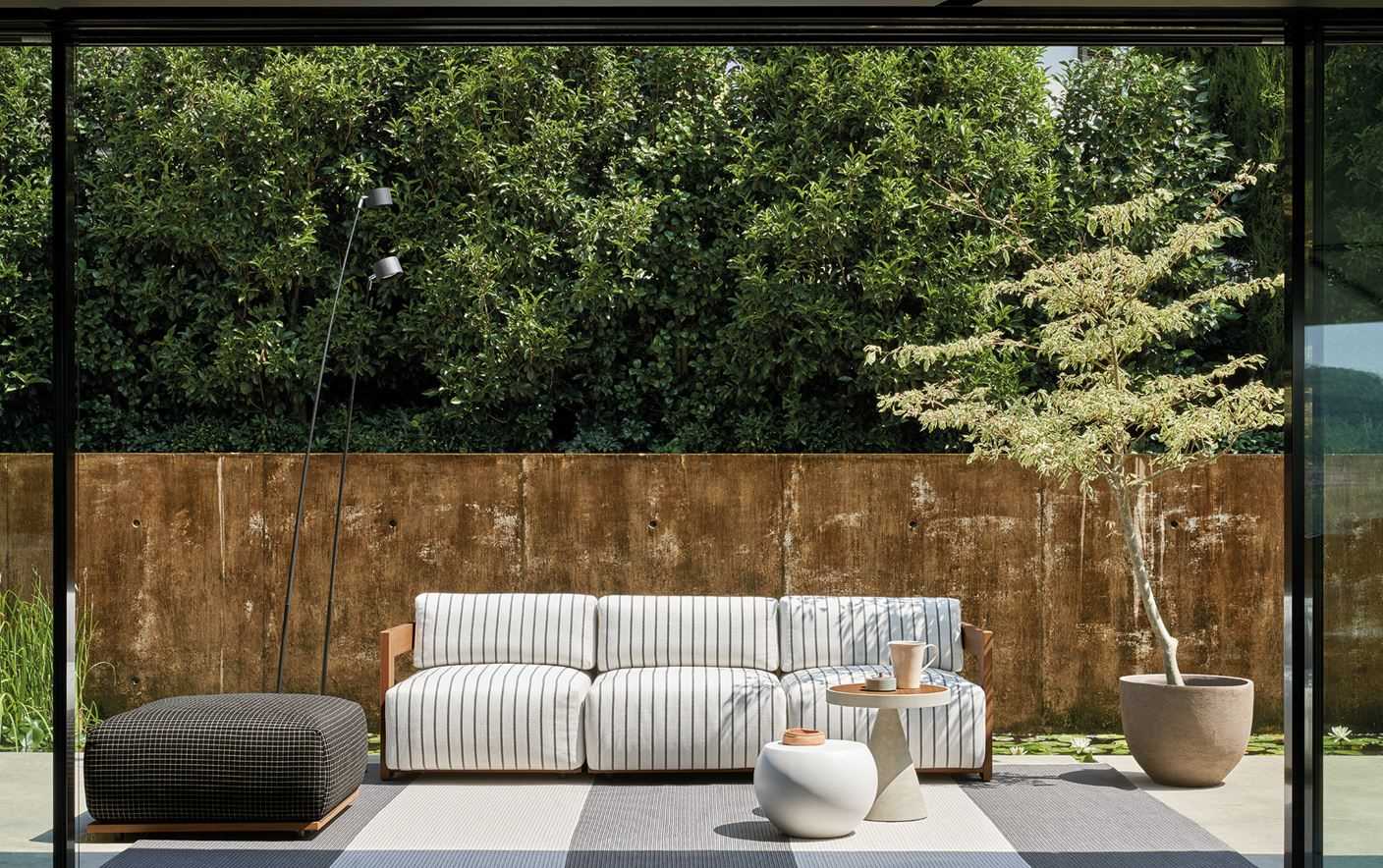 Modular sofa, armchair and lounge bed – available in single and double bed version: the Claud Open Air collection stands out for its minimal design and soft cushions. Sophisticated and resistant, these furnishings are made of solid iroko with protective varnishing. Precious materials and soft padding for a living room and an oasis of relaxation to live ‘en plein air’.