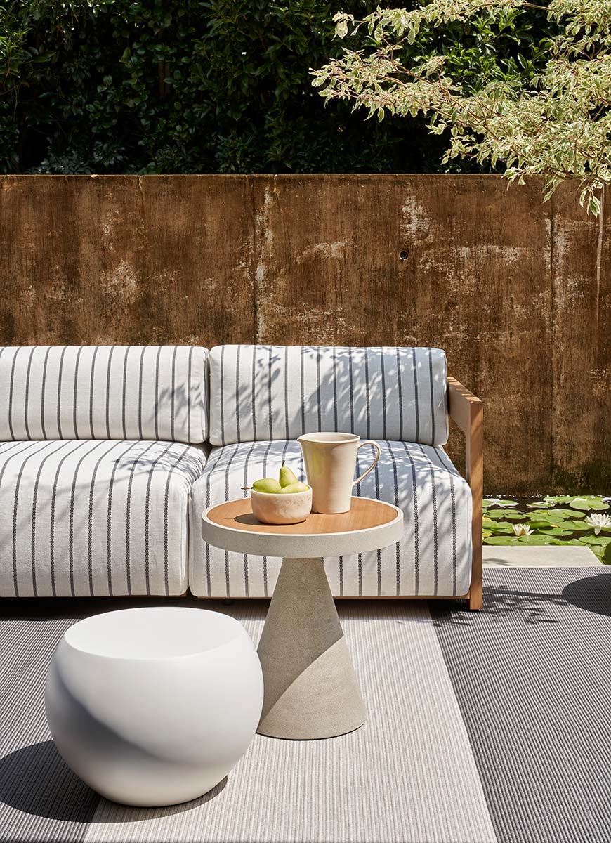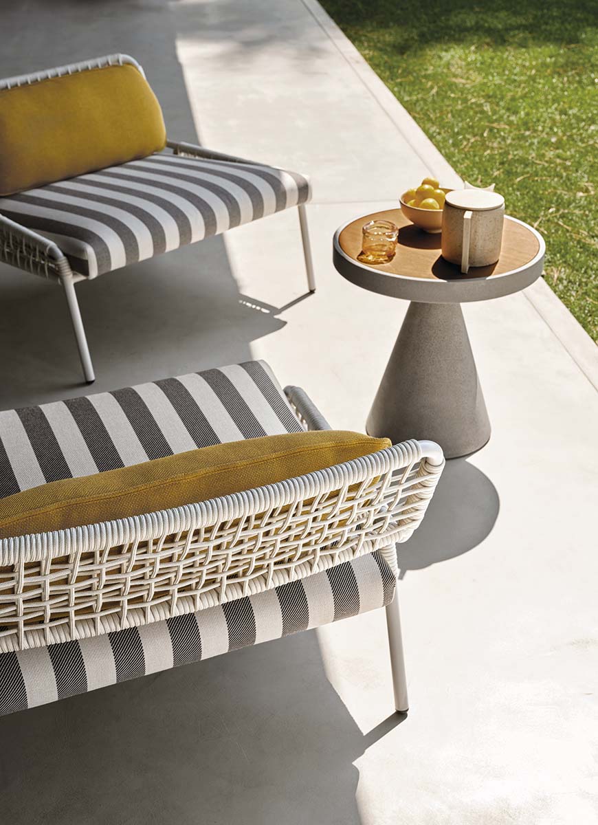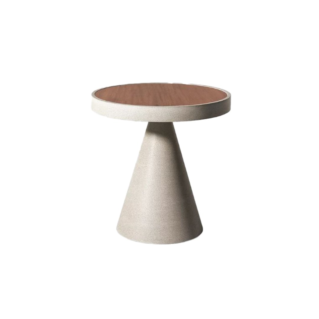 Cone Open Air is a collection of coffee tables with a cone-shaped base in Ductal® concrete with a light grey finish. Made up of very fine natural mineral components and organic fibbers, which make it resistant and flexible, this concrete is of the highest quality and technology, conceived for outdoor use. The top is made of iroko wood and is available with a square or round shape.