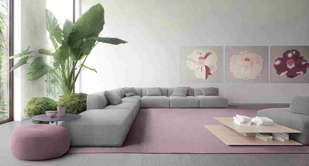 Modular seating system consisting of left, right, central and corner elements, chaise longue and pouf. The Cover series also includes a wooden side table.