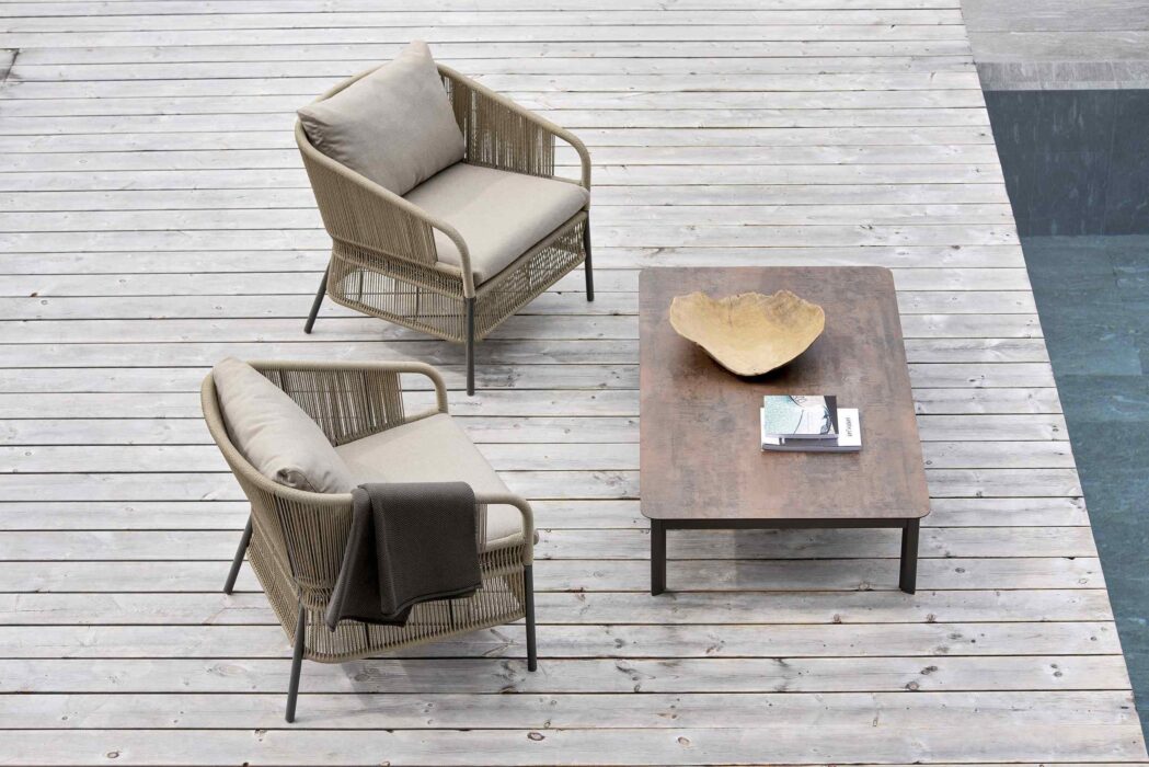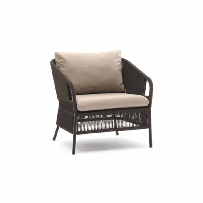 A spacious cushion on the seat and a softer one on the back make this armchair inviting, chosen by many architects and designers to furnish domestic and contract outdoor environments.