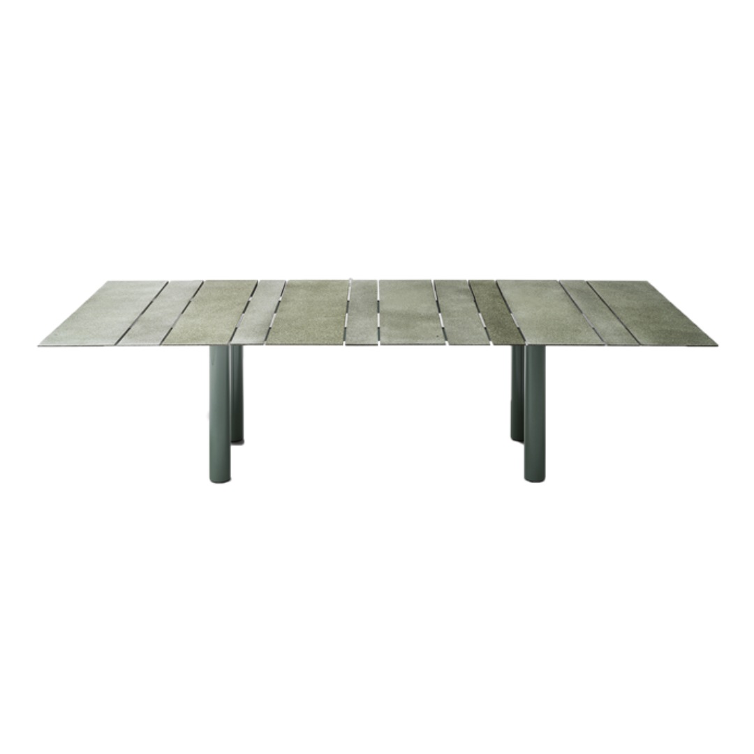 The Glacé finish is the result of an artisanal processing that makes the surface of the natural lava stone particularly brilliant: for this reason, the possible slight differences in colour and appearance of the surface, both on the single slat and between one slat and the other used to compose the top of Dock table, are unpredictable and are the value and the distinctive feature of a fully handmade product.