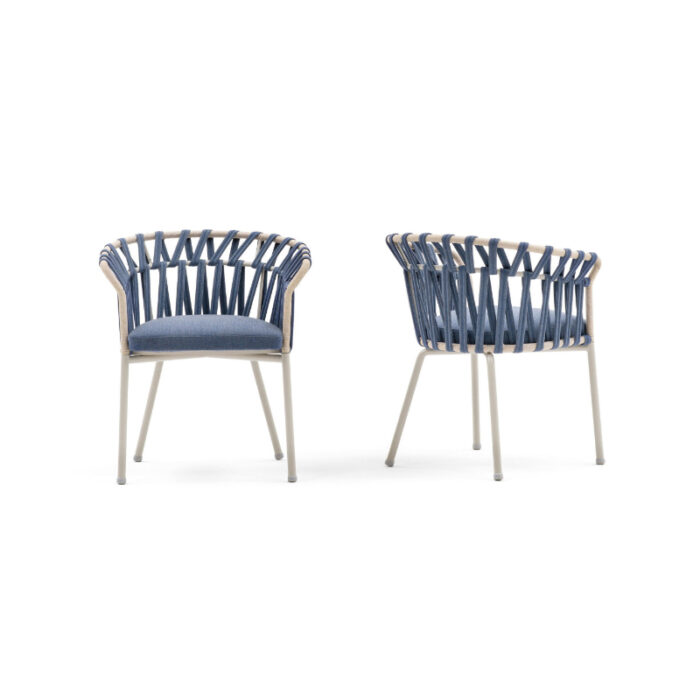 The band in acrylic fabric overlaps the rope weaving that covers the aluminum frame, drawing the surface of the backrest with diagonal lines. A double weaving that becomes an iconic motif of this elegant armchair for the outdoors.