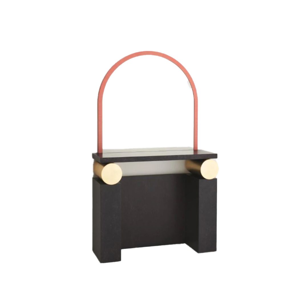 Mirror unit with crystal mirror and Alpi veneer frame. The shelf and the base are in aniline-vanished wood with goldplated cylindrical elements. Every piece is identified by a progressive numbering.