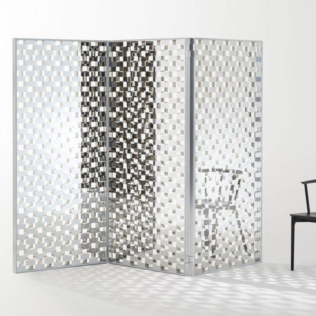 Screen with a special checked decoration on double-sided mirror. Two perpendicularly checked crystals are applied to a double-sided frame in polished brushed aluminum, separated by a gap of a few centimetres. These objects create a game of mirrored reflections, coverings and transparencies that deceive the observer, dissimulating and confusing the objects reflected from the ones screened and vice versa. The screen is made of hinged modular panels.