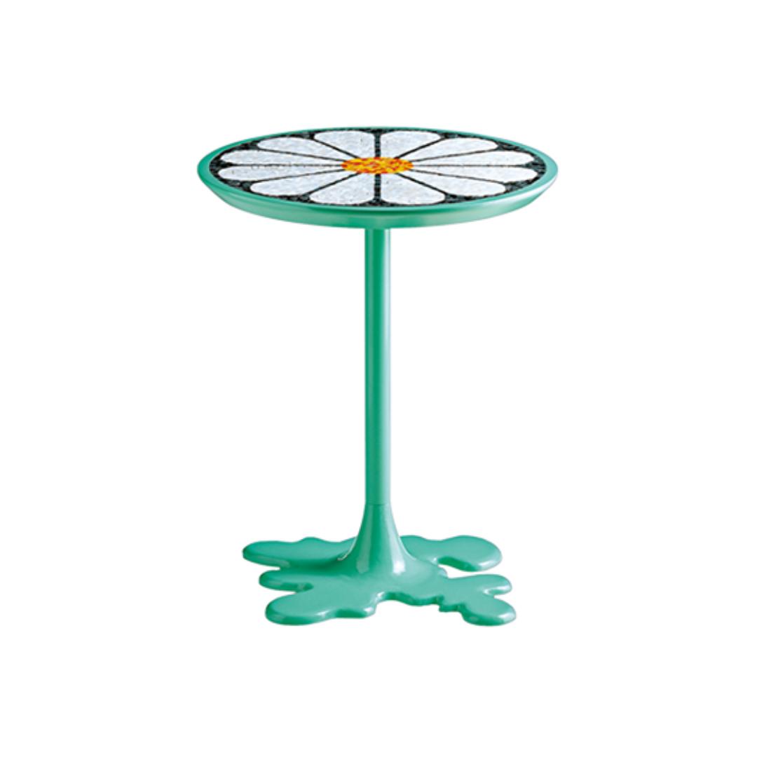 Flower-table. Signed original. Cast aluminum base and steel leg, with green wooden top. Polychrome mosaic decoration built into top.