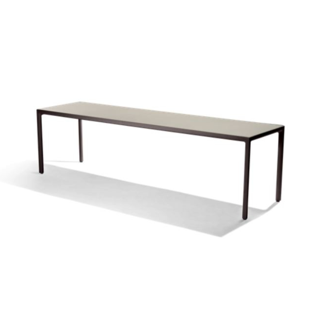 The simplest designs are often the most elegant ones. The Illum table is kept pure and simple with beautifully curved profiles complementing the slim legs. The tabletop is available in teak or ceramics in various colours. The table comes in two widths: the standard 98cm and a more narrow version of 71cm. The latter is not only the ideal solution for more narrow patios and balconies, but also makes the perfect companion for casual dining.