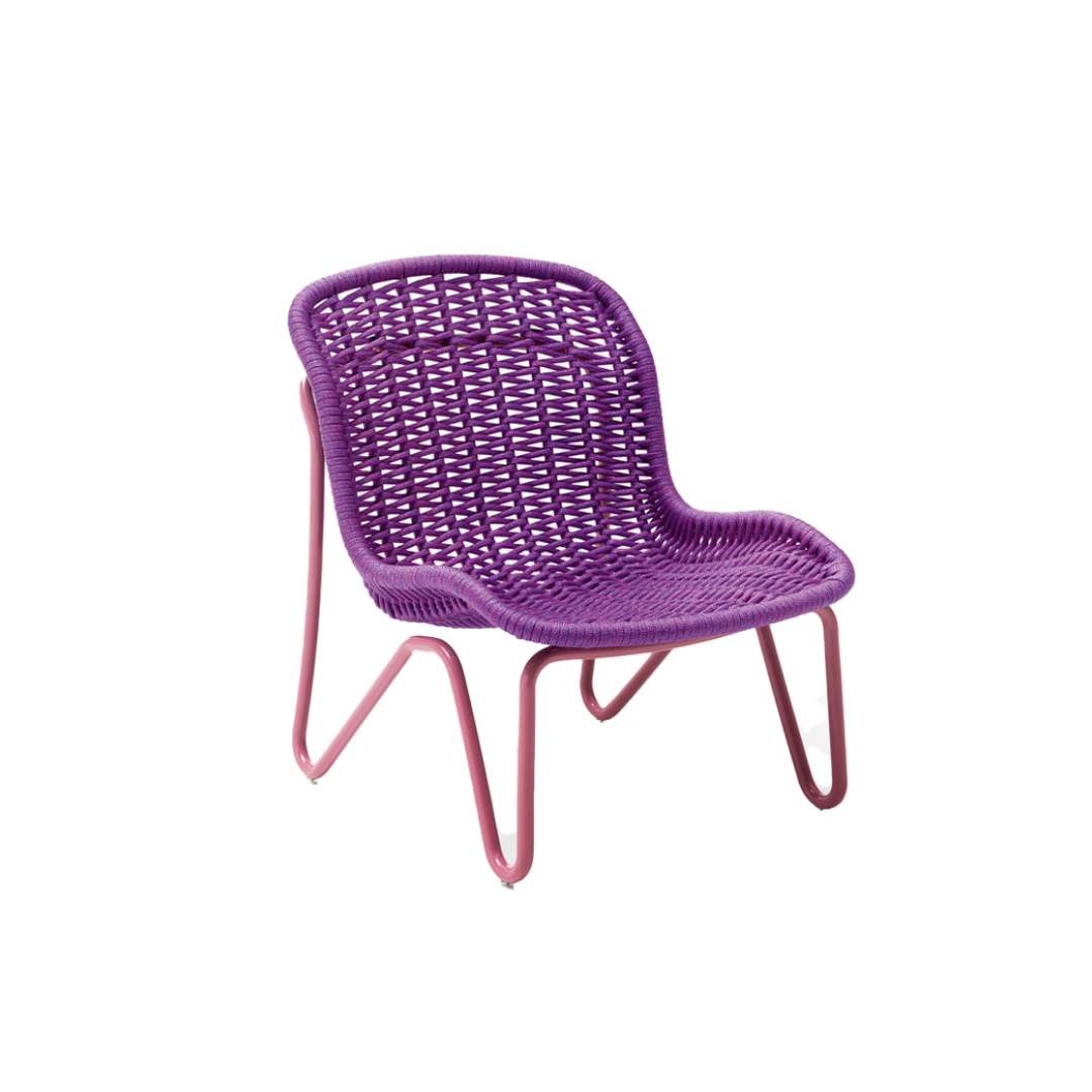 Lounge chair and low lounge chair with fixed upholstery, directly hand woven onto the structure.