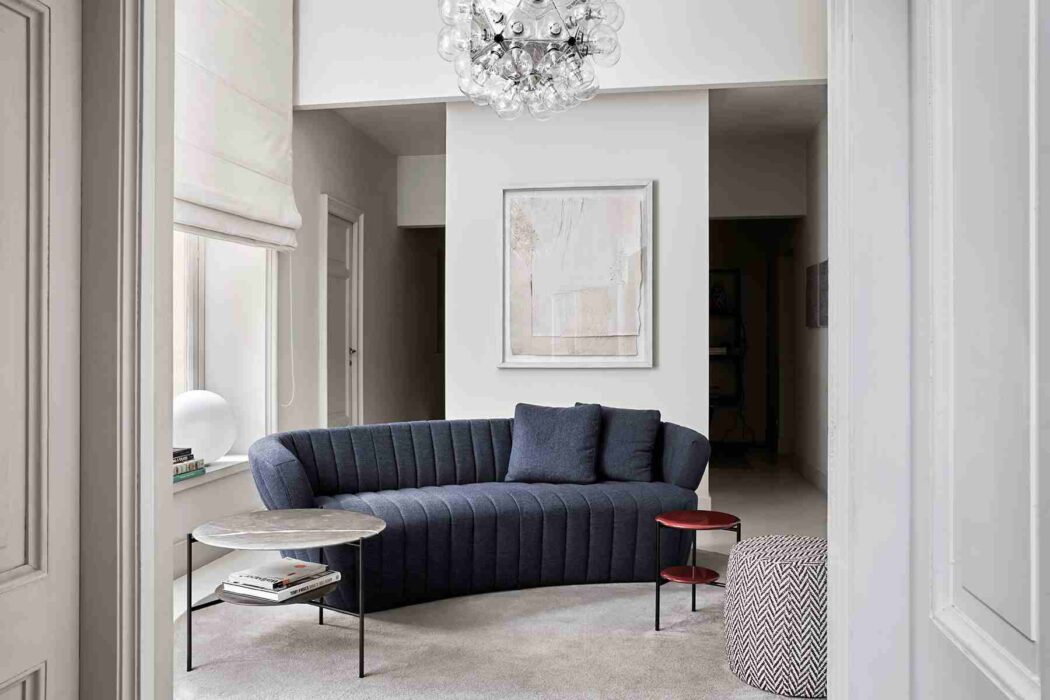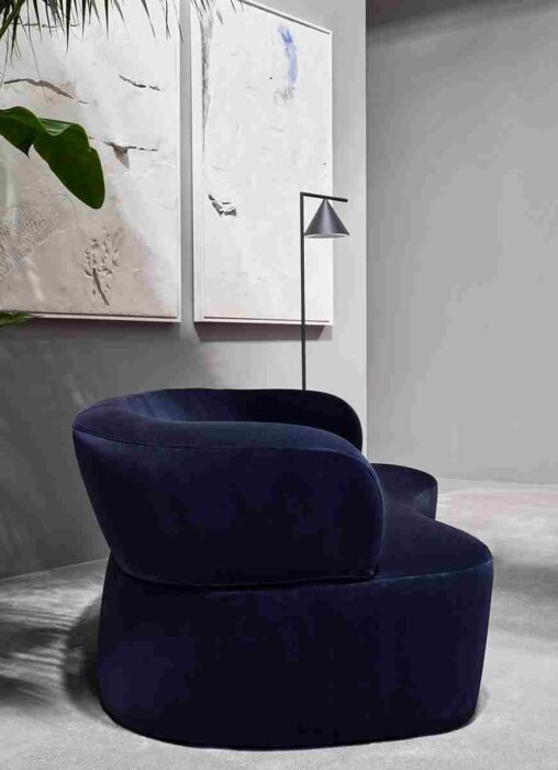 Joseph is a sofa with an aerodynamic line, a shaped tilted to the side ‘bean’, imagined with a double look: a more bourgeois and elegant, completely tight one, and another more casual, entirely quilted one. A convivial element, for conversation, conceived – both for the height of its backrest and for the overall conformation – for a placement in the middle of the room or to be combined with other elements.