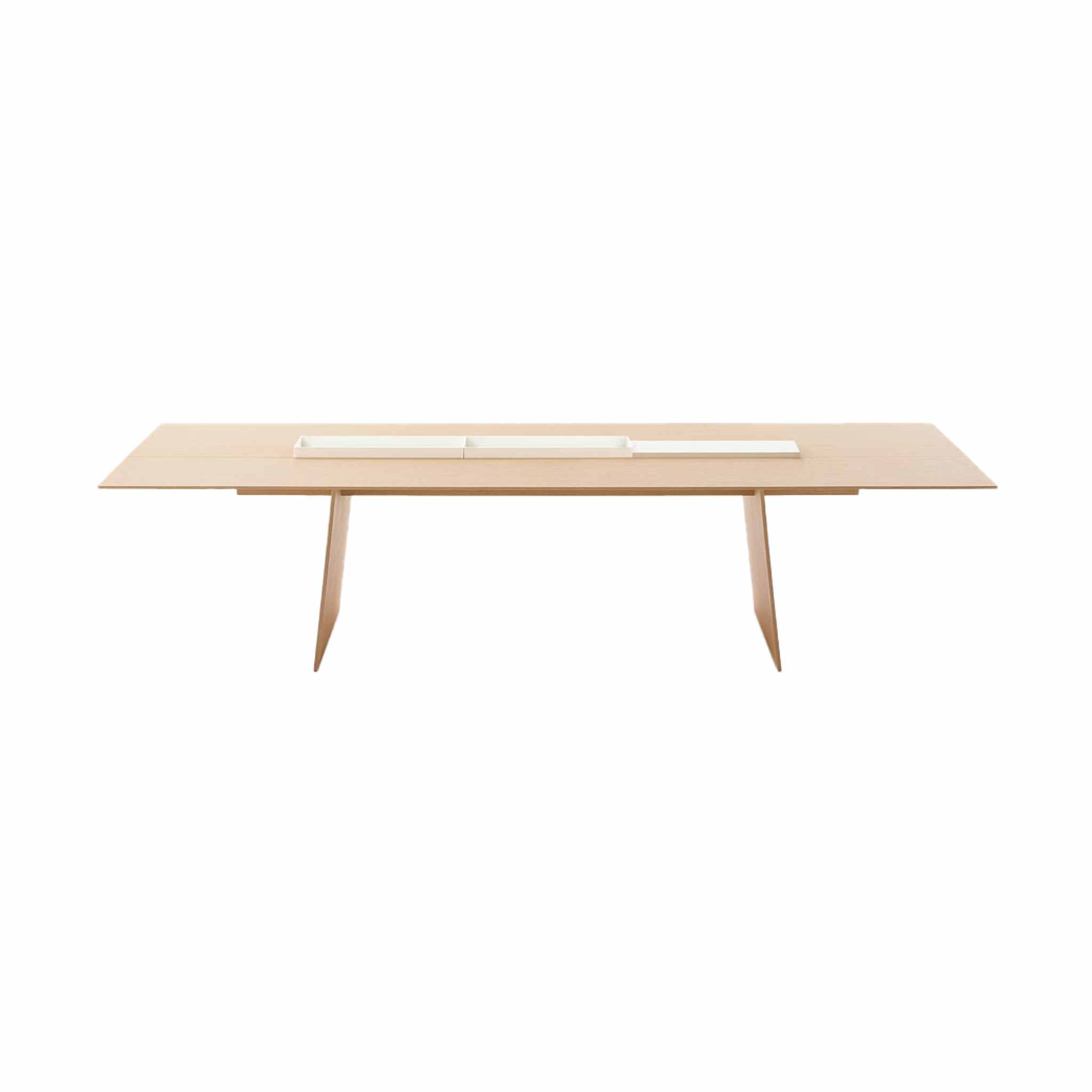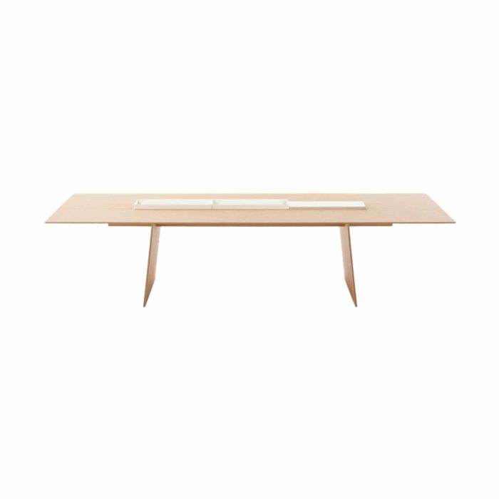Dining table available in two different dimensions. The top features the central section divided into independent and removable elements. It is possible to replace the desired number of such elements with white gloss-varnished metal trays. The series Kanji also includes a side table.