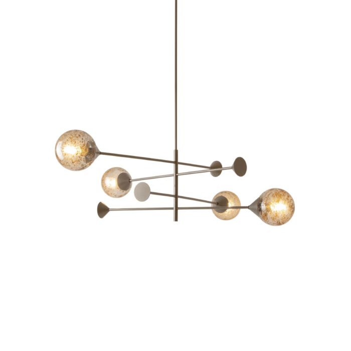Suspended lamp in burnished metal and spheres in blown glass with Murano workmanship.