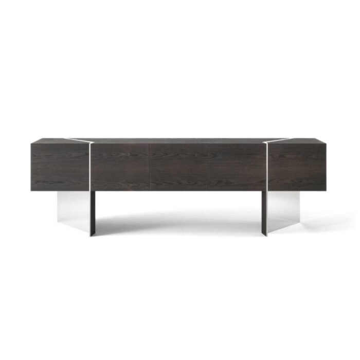 Lama, with its dual personality, can be placed on the wall or free-standing in the middle of the room, to be appreciated in all its details. The shaped foot, a distinctive feature of the object, fits into the body of the furniture diagonally from the floor to the top, emphasising the formal value of the product.