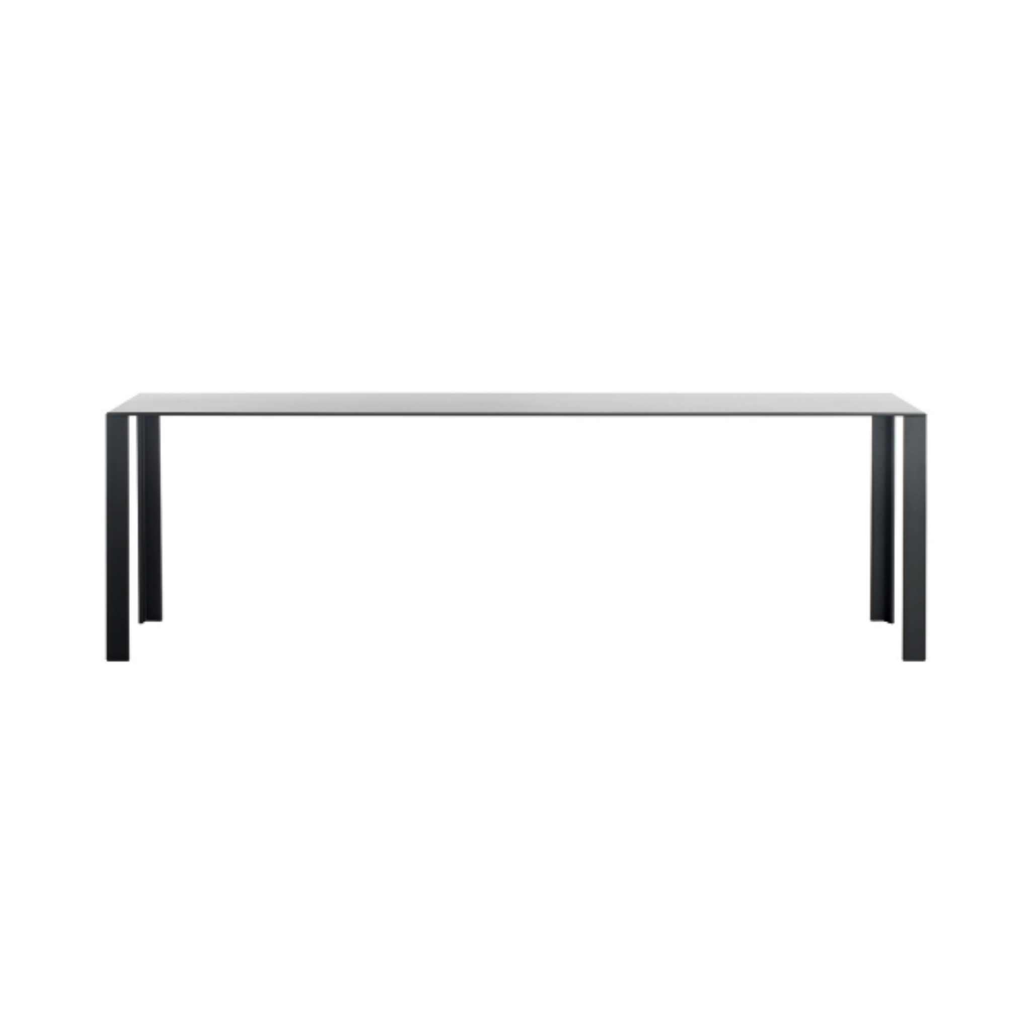 LessLess is a complete range of tables, rectangular and square, painted in different colors. An aluminum table the strength of which lies in a play on corners and folds. The external outline of the horizontal table top is very thin and stiffness and it is obtained by bending the aluminum sheet along inclined planes. Designed originally for the Fondation Cartier in Paris, the LessLess tables stand out for intrinsic elegance and light lines in every environment.