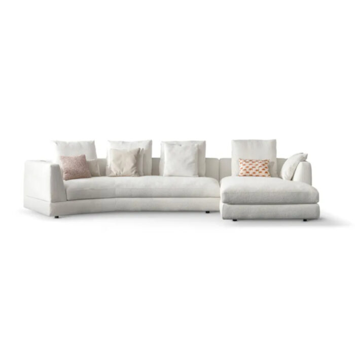 With a rigorous, formal and essential style based on primary geometric shapes, the Liam sofa makes functional versatility and ergonomics of use its outstanding characteristics. By harmonizing with other furnishing accessories, Liam is able to create countless interior design configurations for interpreting the most disparate styles of contemporary living, both in the home, hospitality contexts and reception areas. Liam is available both in a linear version and with curved elements to create even more defined and intimate spaces. The sofa is produced with sartorial care in every detail, such as the painted metal feet, the magazine holder armrest and the leather tray table, offered in a range of sophisticated colours.