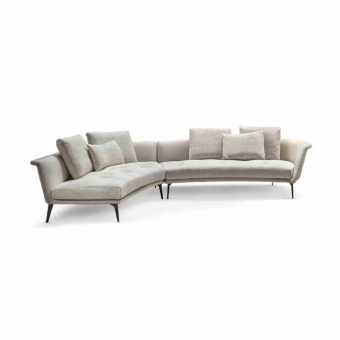 Lovy is a fixed sofa with an unusual silhouette: the semi-oval shape encourages conversation and the dual-height backrest