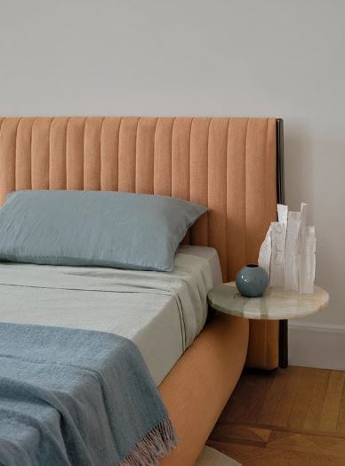 The timelessness of its form meets the modern concept of flexibility applied to materials. The classic quilted headboard becomes malleable with a simple gesture and reinvents the frame: open and graphic, then geometric and airy, or protective and intimate. The gaze widens and closes and each time rests on a perfect image.