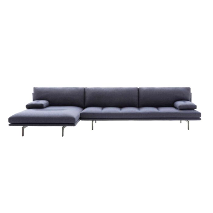 Milano+ is the newest design evolution of Milano, the monobloc sofa first introduced in 1982. This new series of elements, with the addition of a long armchair and rectangular pouf, can create an extended range of modular solutions, both linear and angled. This sofa stands out for its essential form and its rigorously rationalist proportions. The generous seat is divided into vertical bands with parallel stitching, and rectangular cushions serve as both backrests and armrests, in an informal approach to upholstery. Aluminium alloy feet, now more modern in form and in material, confer renewed lightness and a slim line to the overall volume. An elegant, refined sofa of timeless design.