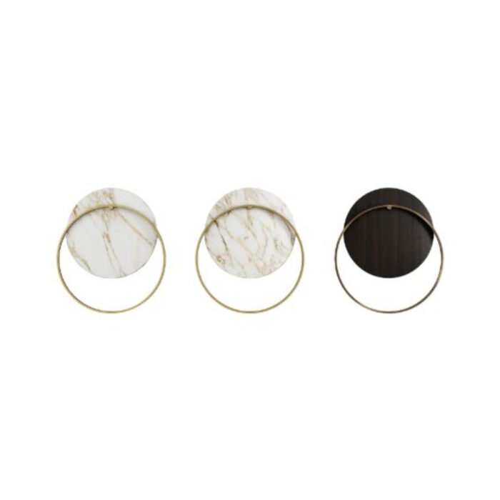 A metal ring. As precious as a jewel can be. A source of light and decoration for the walls of every home, it is placed on a disc whose finish enhances the combination of solids and voids. It is in fact two circles. Declined in two different ways. The first, more ethereal, feeds on the fullness of the second, on which it lives and rests.