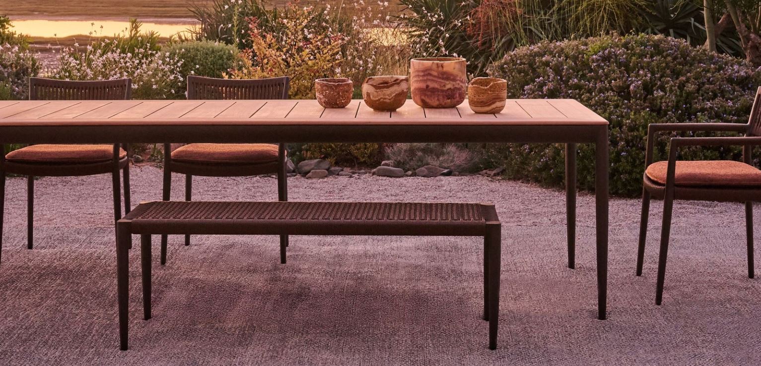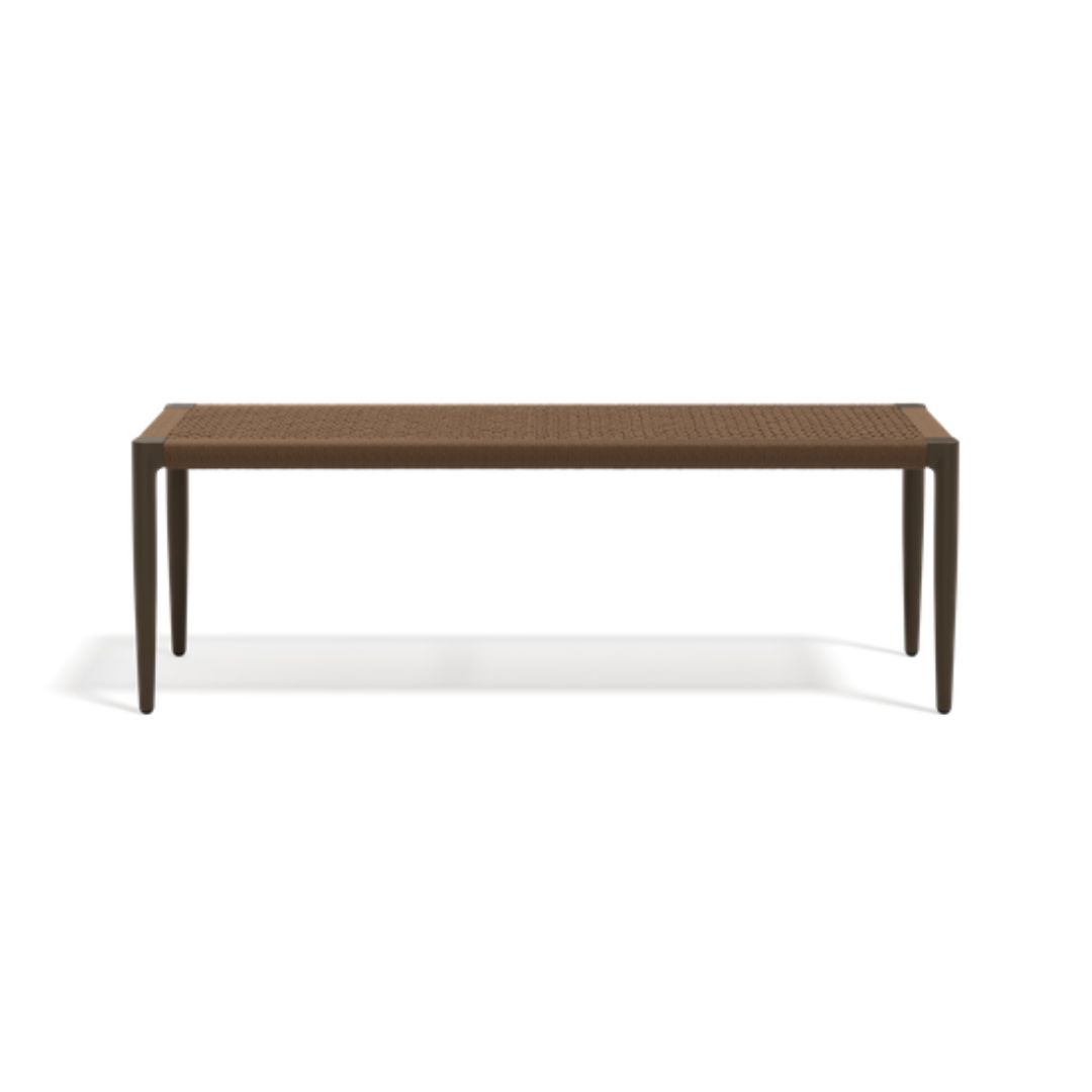 The Nagomi bench combines an ultra-light cast aluminium frame with organic contours and a tactile surface. Its slender legs are detachable for effortless storage and transport, while the distinctive weaving remains seamlessly integrated into the frame. Designed for both dining and standalone use, this versatile piece offers ergonomic comfort, refined texture, and a generous sense of togetherness. Available in two refined colour combinations of frame and weaving, the Nagomi bench truly reflects a 360° approach to craftsmanship.