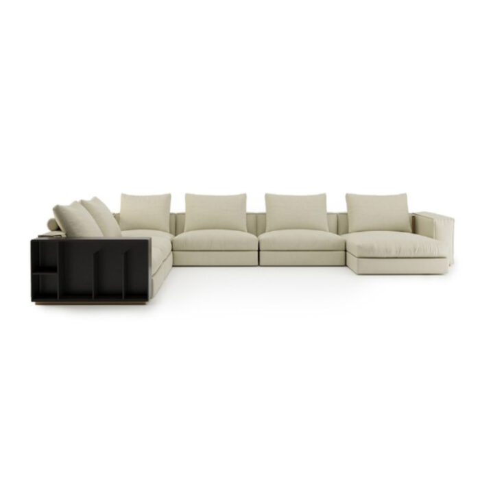 Range of modular sofas characterised bookshelf–armrests, shelves- backrests and side table units. Also features raw-cut leather.