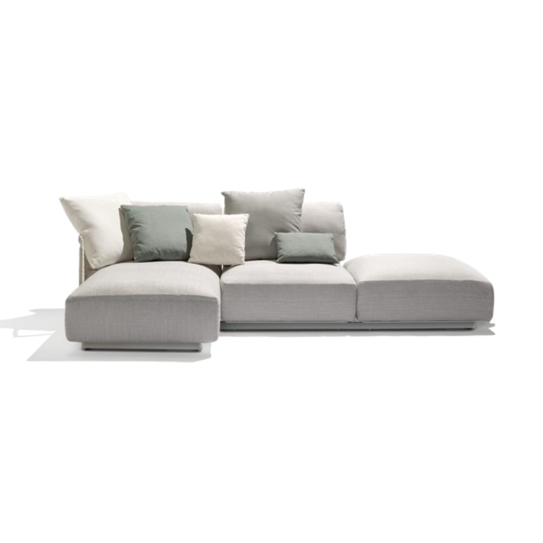The sofa has an airiness and architectural appeal thanks to the natural curve of the frame and open weaving in Canax®. The extra-soft and airy outdoor cushion filling makes Nodi a supremely comfortable sofa, as well as one of the most adaptable with three seating elements and four seat depths.