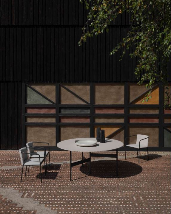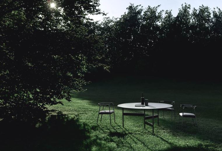 Structure of three slender legs, connected through metallic strips placed at different heights: they seem to chase each other in a graphical play that marks the rhythm of the table, offering a different perspective each time.