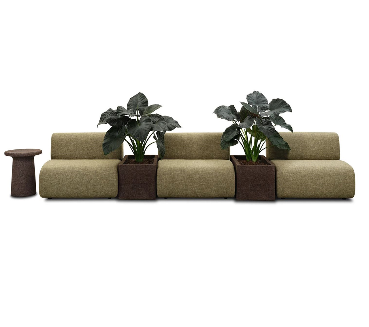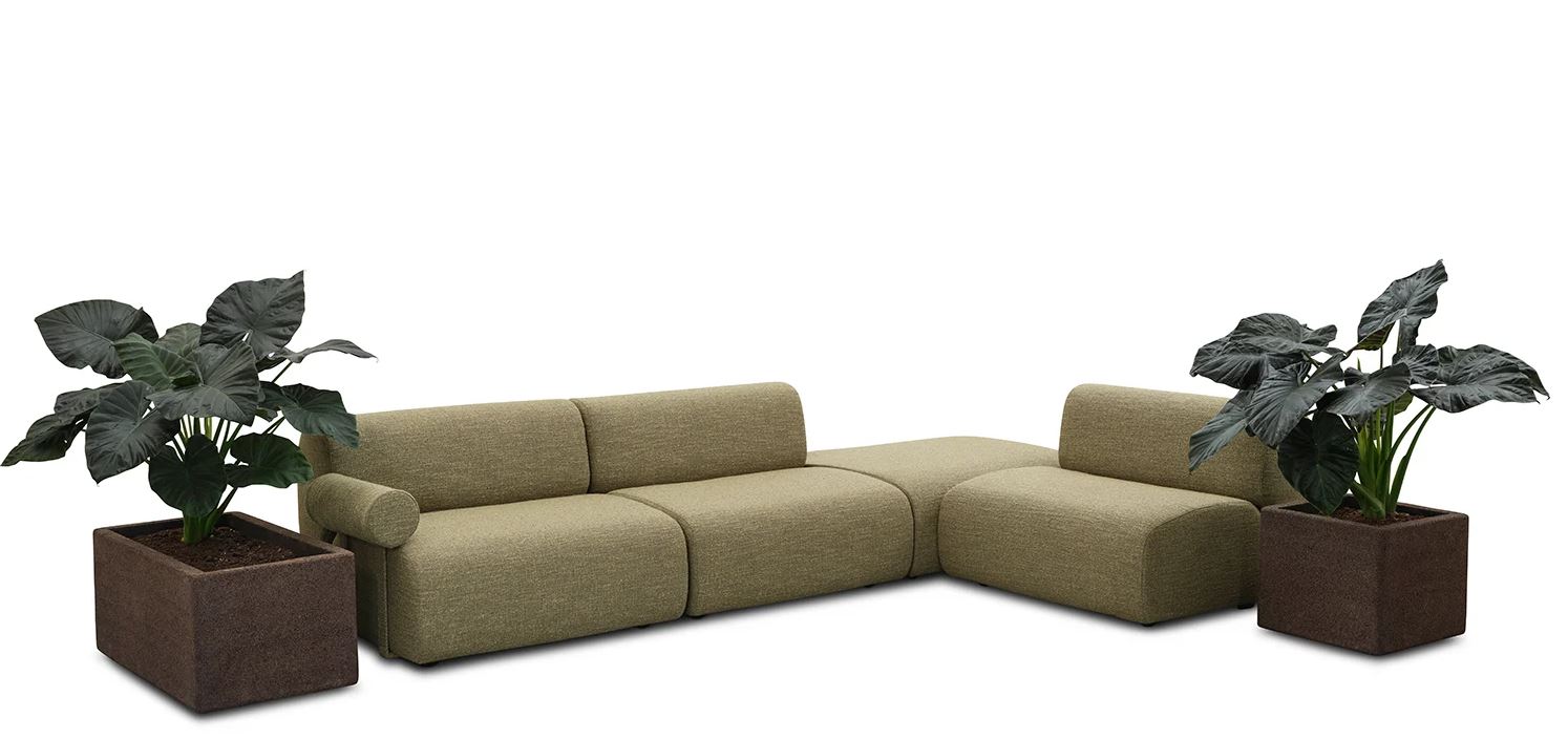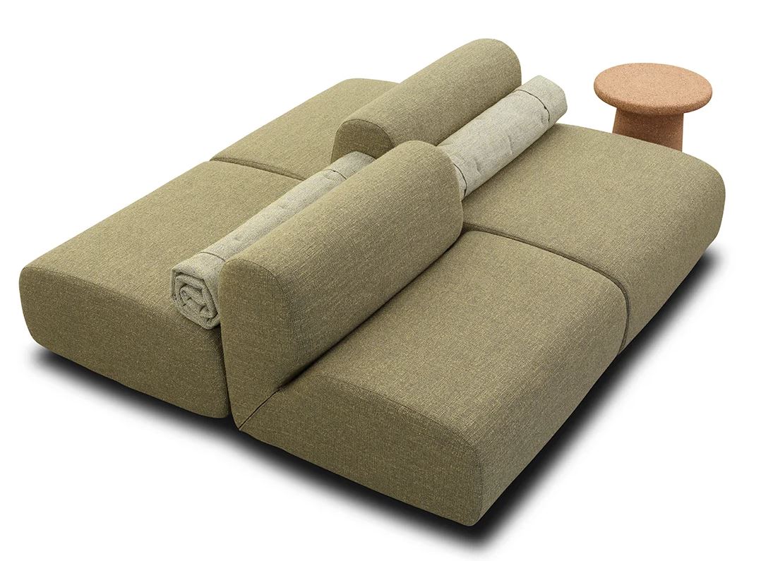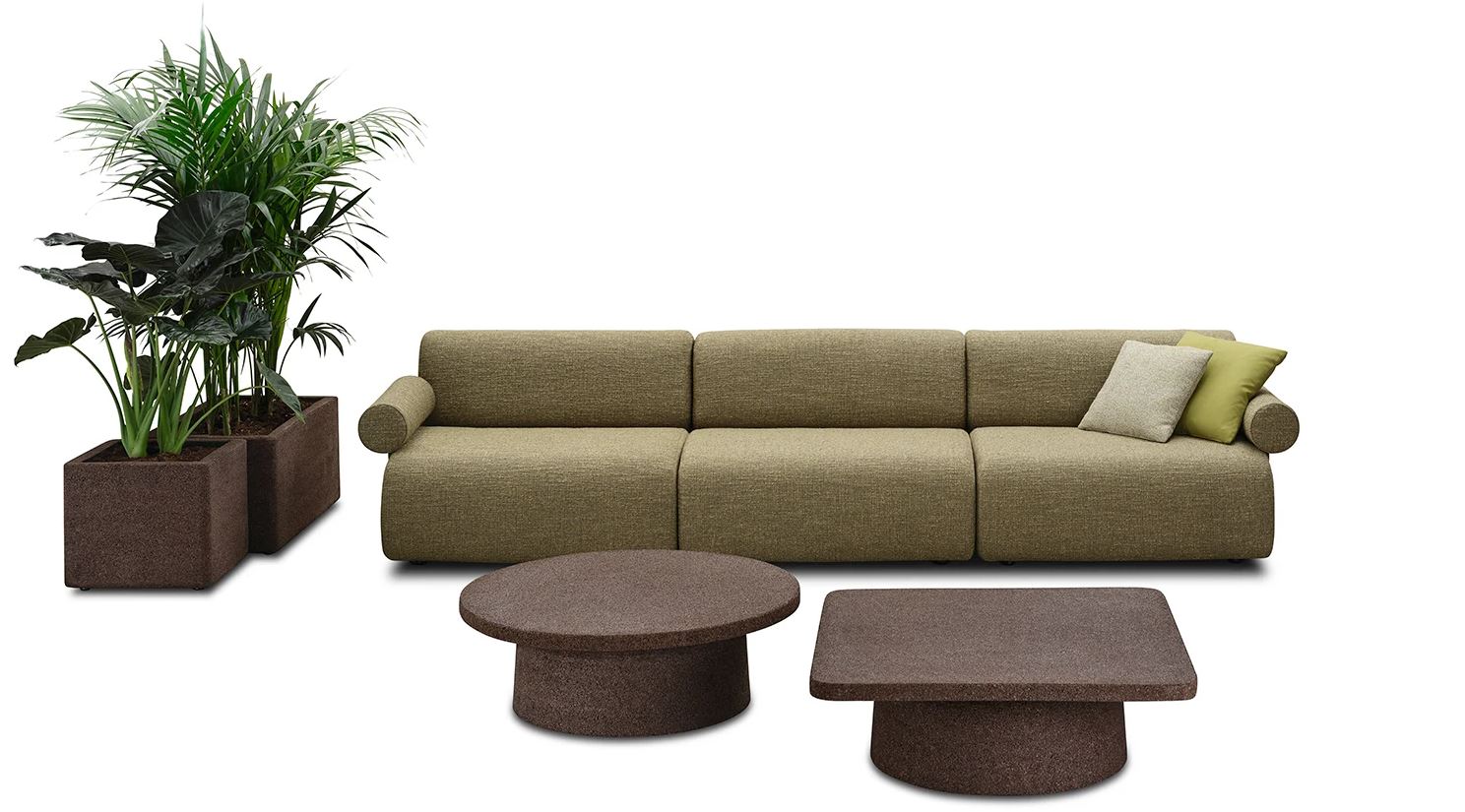 The simplicity of its volumes conceals a wide range of configurations, so that even when used in smaller spaces, Oasi maintains a strong and expressive presence. Among its distinctive features is the use of natural materials such as cork for small tables and plant holders, paired with rugs made of woven matting and recycled PET.