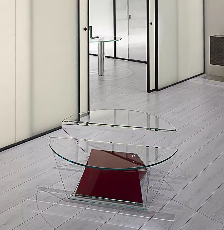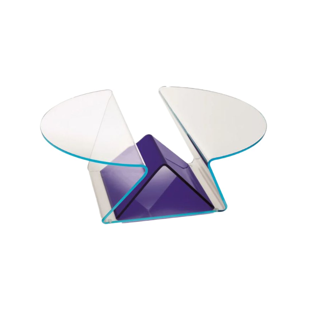 Extremely functional low table with a light aspect and soft and gentle shapes in 12 mm extralight glass, shaped and curved thanks to a complex process of glass bending, obtaining two cantilevered tops separated by a practical compartment where objects can be stored. Positioned in the centre is a functional magazine rack element made of curved glass with a reversed “V” shape, available in the transparent colours ruby red, blue, emerald green or transparent extralight.