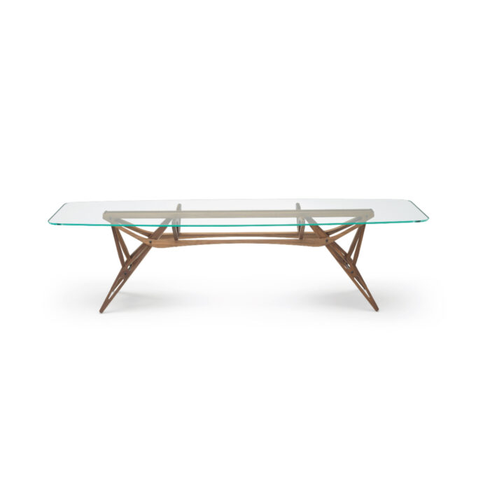 Articulate and complex shapes, but which once understood can astonish owing to the constructive intelligence of a perfect mechanism where every element slots together, matching, twinlike with precision to the others, through precise (and custom-design) metal joint systems. True masterpieces, like the Reale table, created with a compact, transparent skeleton embellished with a crystal top that seems to frame it.