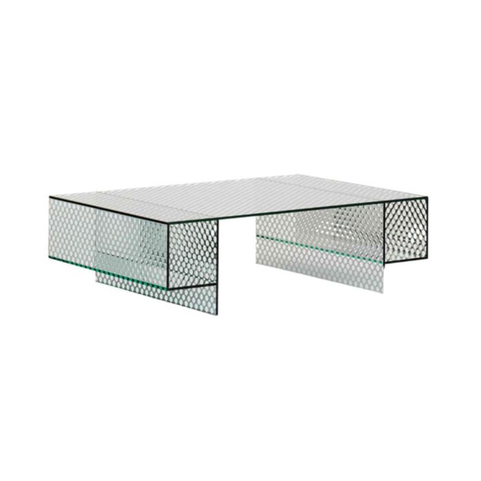 Collection of low tables, consoles and storage furniture, completely created from a special double-sided mirrored glass, with a decorative pattern made from round transparent marks, simulating a perforated metal sheet. All the glass is tempered and UV bonded. The two doors are opened and closed with a push-pull system.