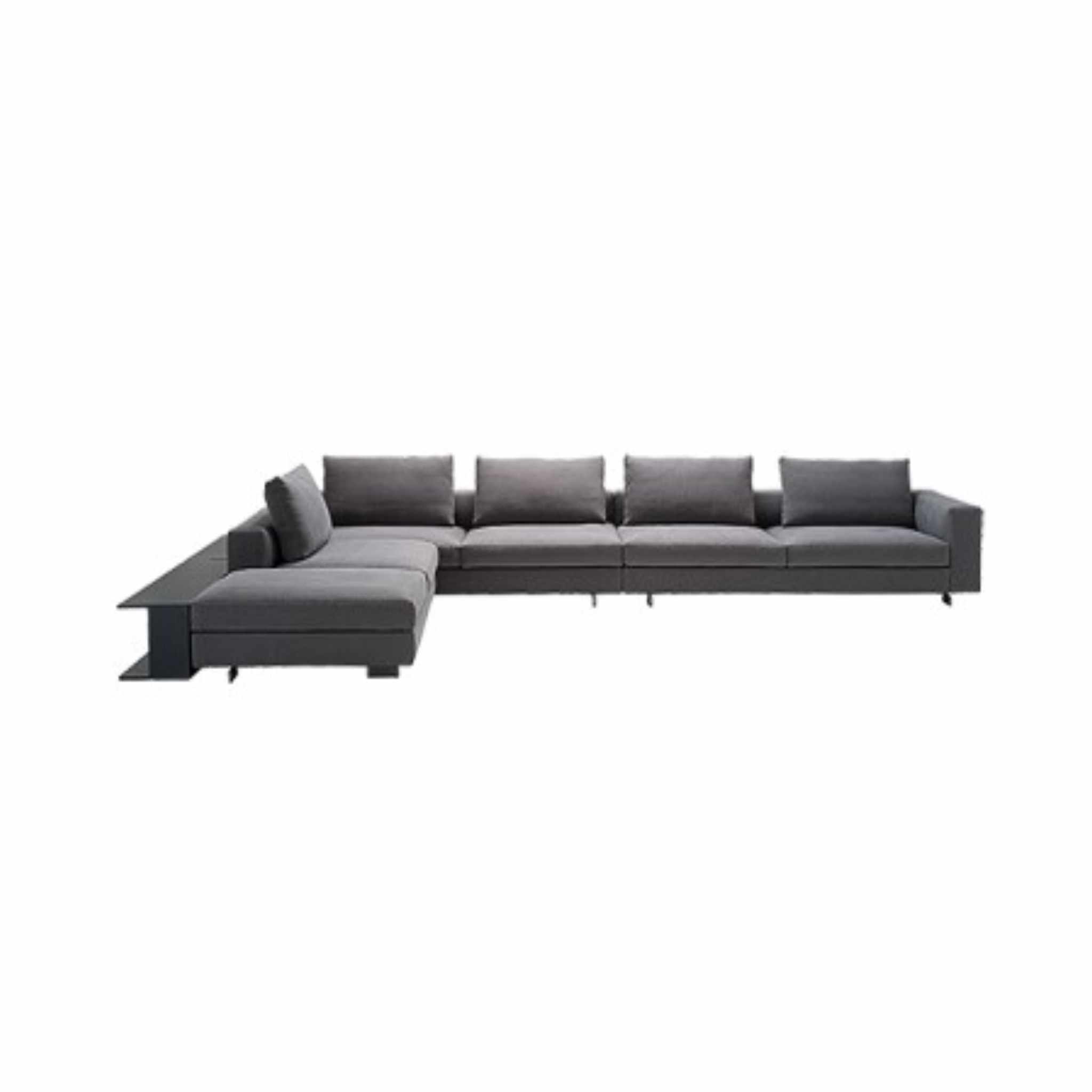 The seating is low, wide and generous in both the monobloc sofas with pouf, and the straight or angled modular sofas. Compositional integration takes place with small, versatile small tables and bookcase for multifunctional areas of relaxation.