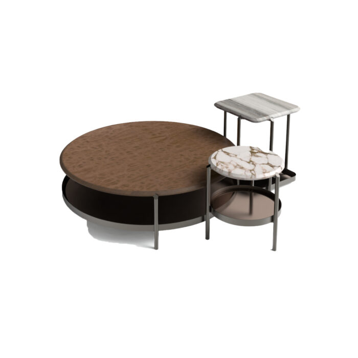Round, square, rectangular and pentagonal low table in metal pewter finished, with top available in different materials.