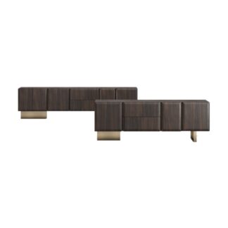 Sideboard with aluminium structure and legs, various finishes. Elements in mdf veneered walnut Canaletto or oak stained wengé. Top available in different materials and finishes. Adjustable in height smoked glass internal shelf.