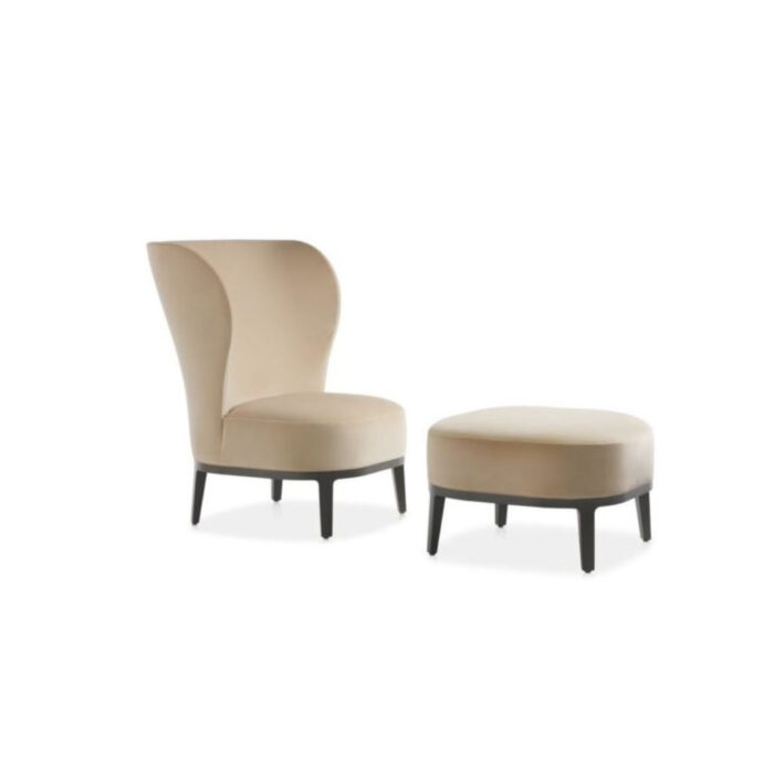 Wing chair, sofa, pouf, and coffee tables compose the Spring collection.