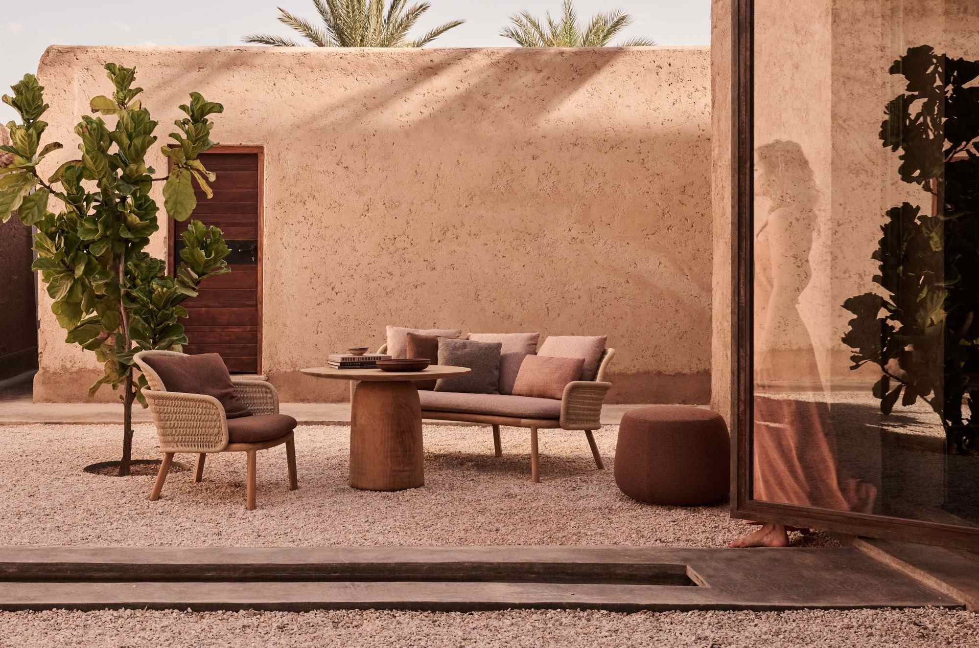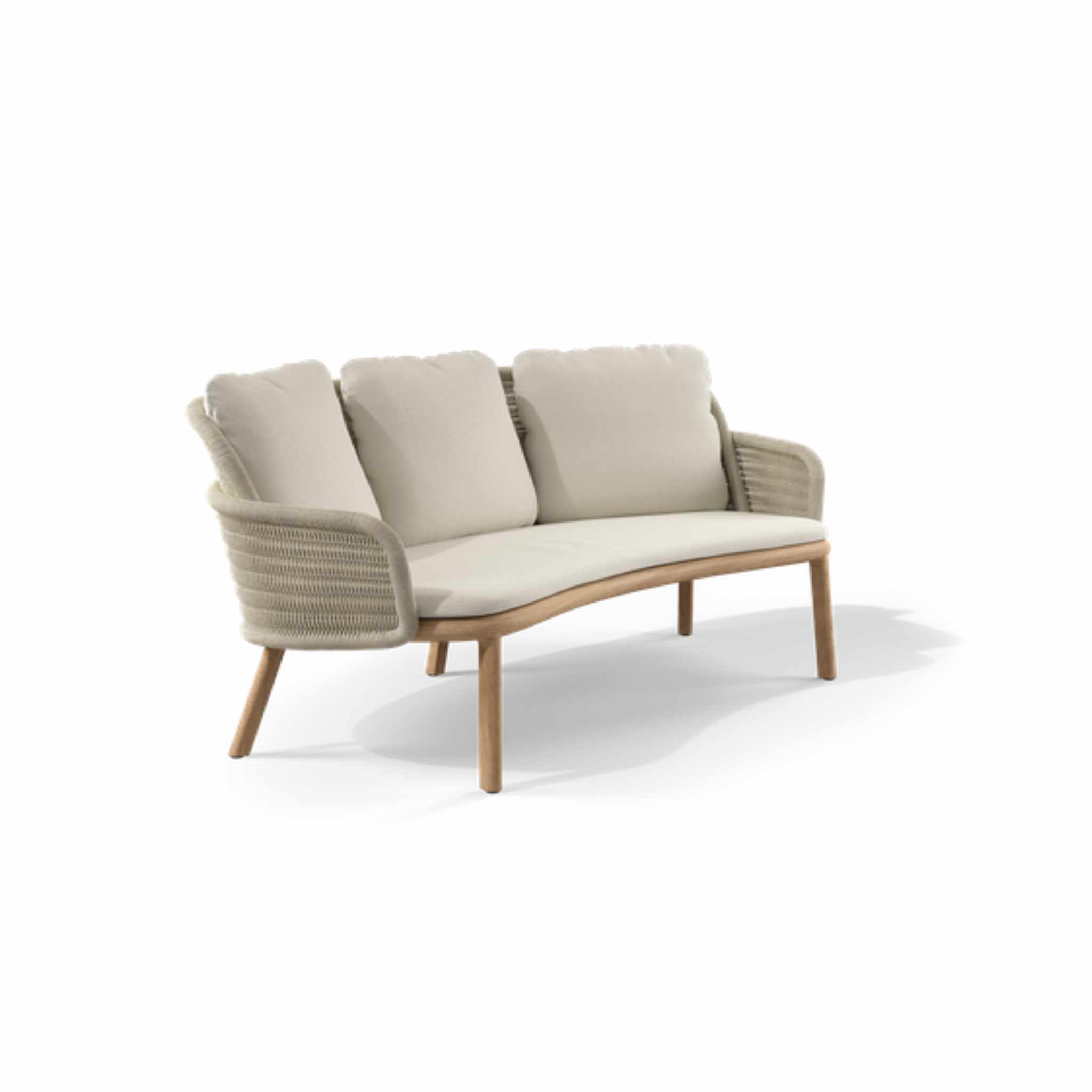 The Suro Banquette truly enhances the combination of two materials: the elegant rigor of teak wood or powder coated aluminium and the flexibility of the braided rope weaving. Both materials elegantly blend into an exceptional design. The wood and aluminium both affirm the structure of the seat. The fiber backrest, as if hanging from the seat, forms an embracing cocoon-like flower petal which provides unique comfort thanks to its roundness.