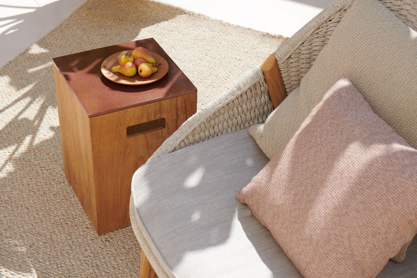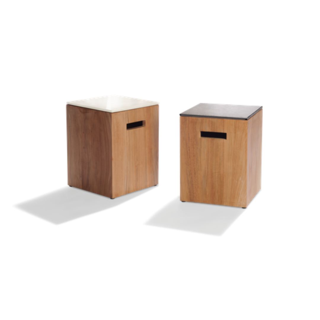 The Tairu side table combines functionality with natural beauty and craftsmanship. The base is made of a sturdy, hollow teak rectangle with inset handles, so it can be moved around easily. What sets Tairu apart is the top, made from 400-year-old glazed lava stone from the Vesuvius. The coloured glazing is added by hand. Baking at a high temperature creates a subtle craquelure finish, giving each top a unique look and making the stone heat, water, UV and stain-resistant, not to mention easy to maintain. The table top is available in four sophisticated, nature-inspired colours.
