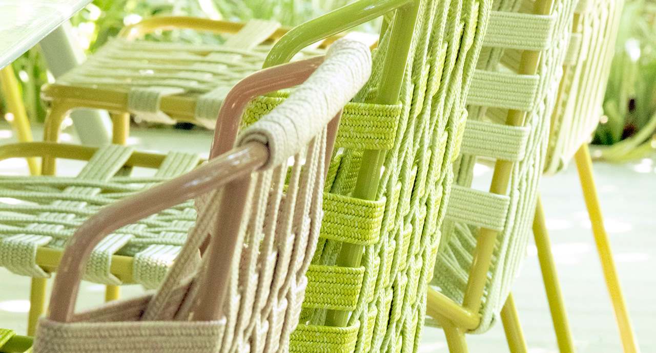 Upholstery: fixed, hand-woven with elastic straps of two different sizes, covered in Rope yarn.