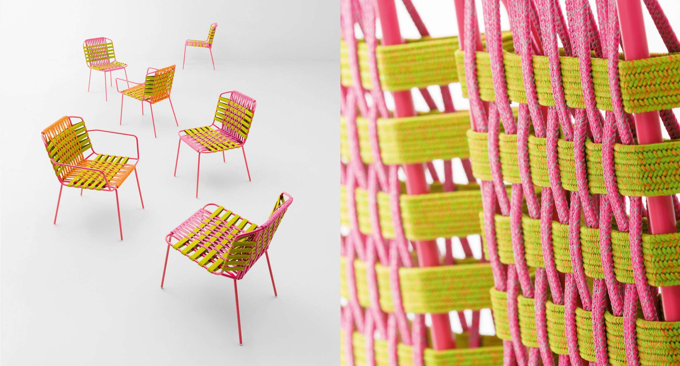 Chairs with and without armrests with fixed hand-woven upholstery on the frame.