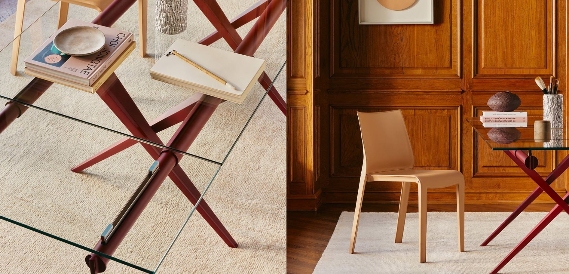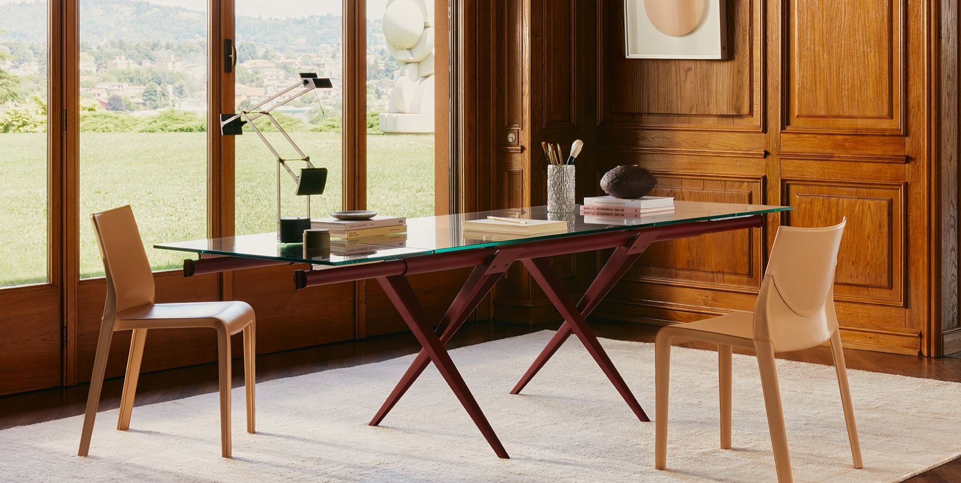 The introduction of color in Tender’s lacquered frame completely transforms the perception of the product. The new finishes bring freshness and modernity, updating the historic design and giving the table a new life. The tones highlight the essential forms, enhance the lightness of the glass top, and make Tender an even more contemporary and distinctive design object.