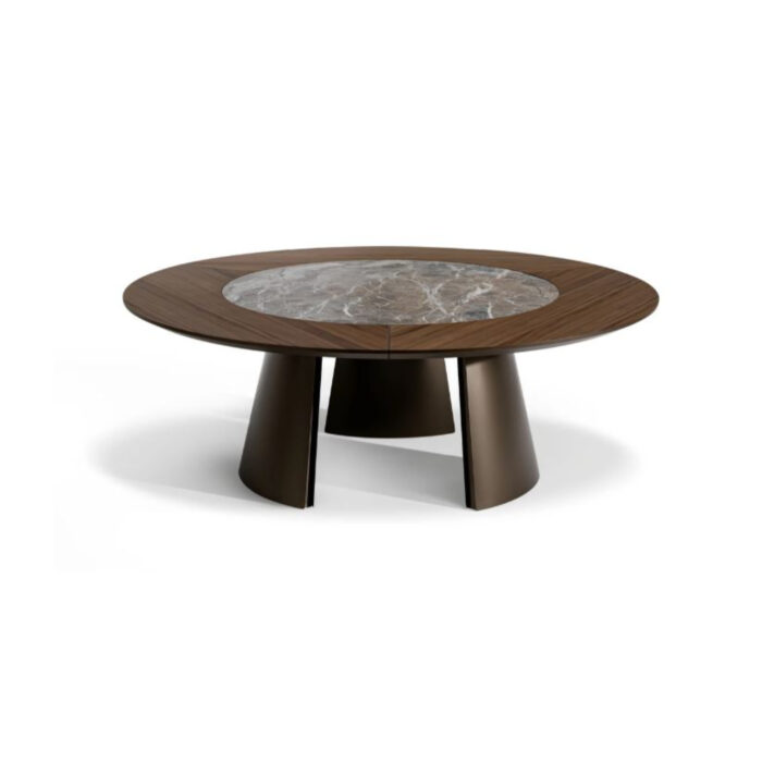 The Torii table designed by Marconato & Zappa clearly demonstrates its exotic inspiration: the slightly inclined metal elements that make up the base recall the entrances to Japanese Shinto shrines from which this round wooden table takes its name. The Torii ST (Swivel Top) version with rotating top catches the eye thanks to the large circular top surface which features an interesting interplay between materials and which combines the outermost wooden frame with a rotating central ceramic section. The result is a contrast of materials and finishes for a table with a significant theatrical presence.