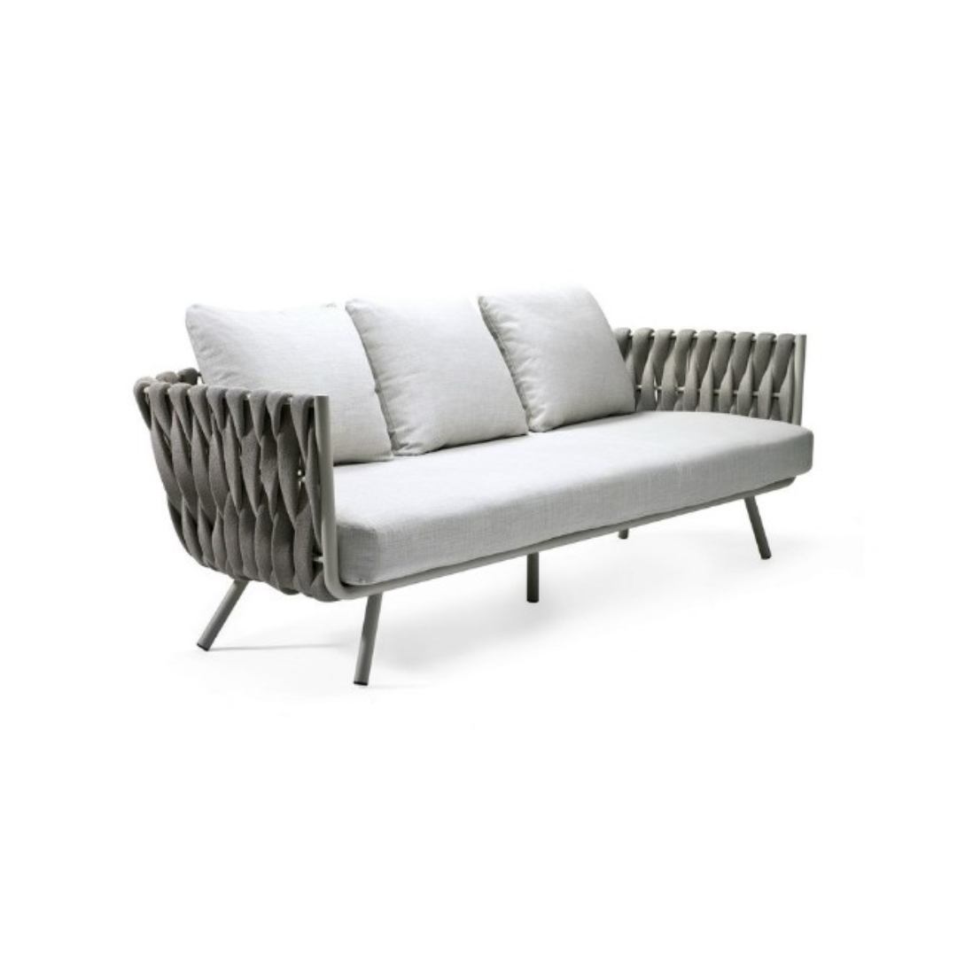 The Tosca outdoor sofa is simultaneously warm and inviting, stylish and intriguing. It was the first time TRIBÙ called upon a female designer to draw an outdoor furniture piece and that is evident in the design. Rounded forms, tapered legs and an elegant seating shell in powdercoated stainless steel, upholstered with extra-wide braiding. The material for the braiding is genuinely innovative : foam mousse is encased in a seamless sheath of knitted textilene and polyolefine which makes the material weather-resistant, but also surprisingly soft to the touch. The seating comfort is especially pleasant, thanks to the comfortable outdoor cushions.