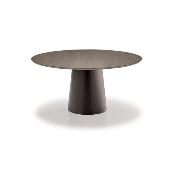 Dining table with stainless steel or lacquered metal base, various finishes. Multi-layer Finnish birch wood top 26mm. thickness, 45°-cut edge, walnut or oak veneered, various finishes.